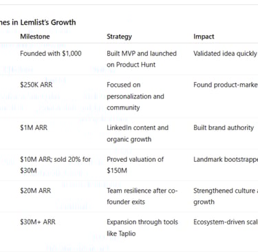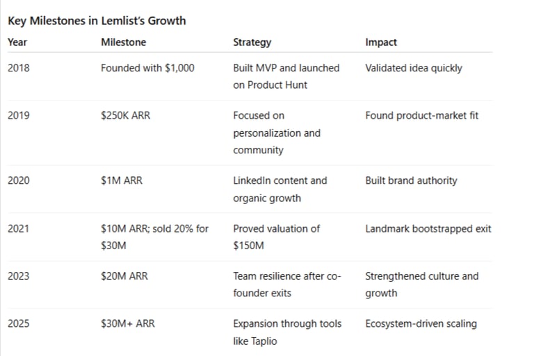 By 2025, Lemlist grew into the core of Lempire, a suite of sales and marketing tools valued at over $150 million, generating more than $30 million in annual recurring revenue (ARR) — all bootstrapped from day one.