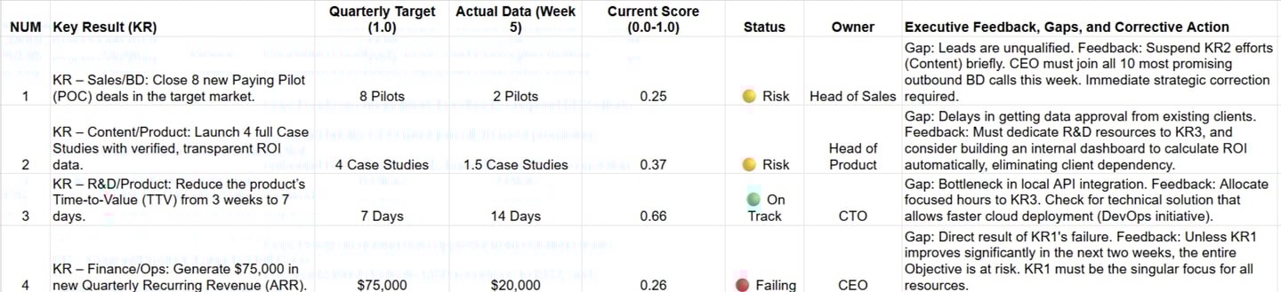 The "Deep Dive" Session – Immediate Gap Remediation: Real discussion happens in "Deep Dive" sessions, held only when a KR is at risk (score below 0.5). R&D and Product tasks are then prioritized based on the most immediate sales and marketing needs.